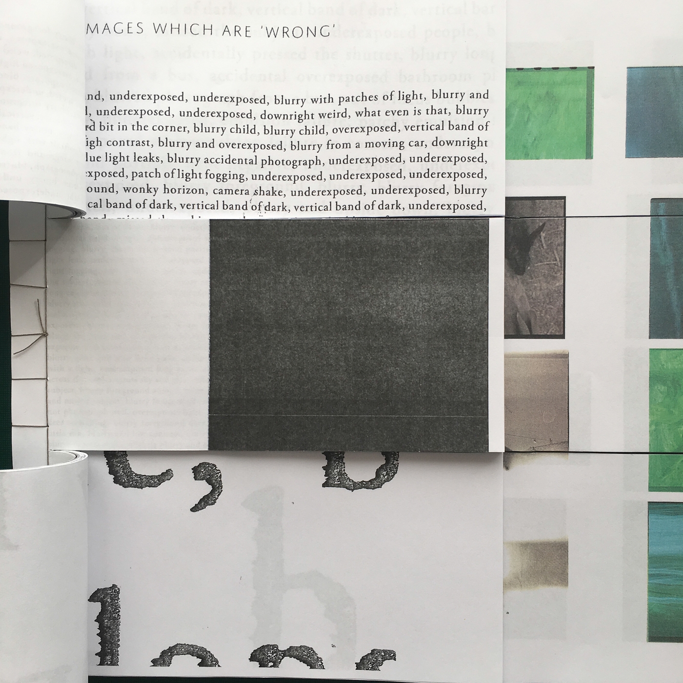 Exploring process and chance through the layering of instructions: Gather images which are 'wrong' > Format into a text > Add photocopy noise > Make a single picture into a series > Bind into a book with the pages cut in thirds.